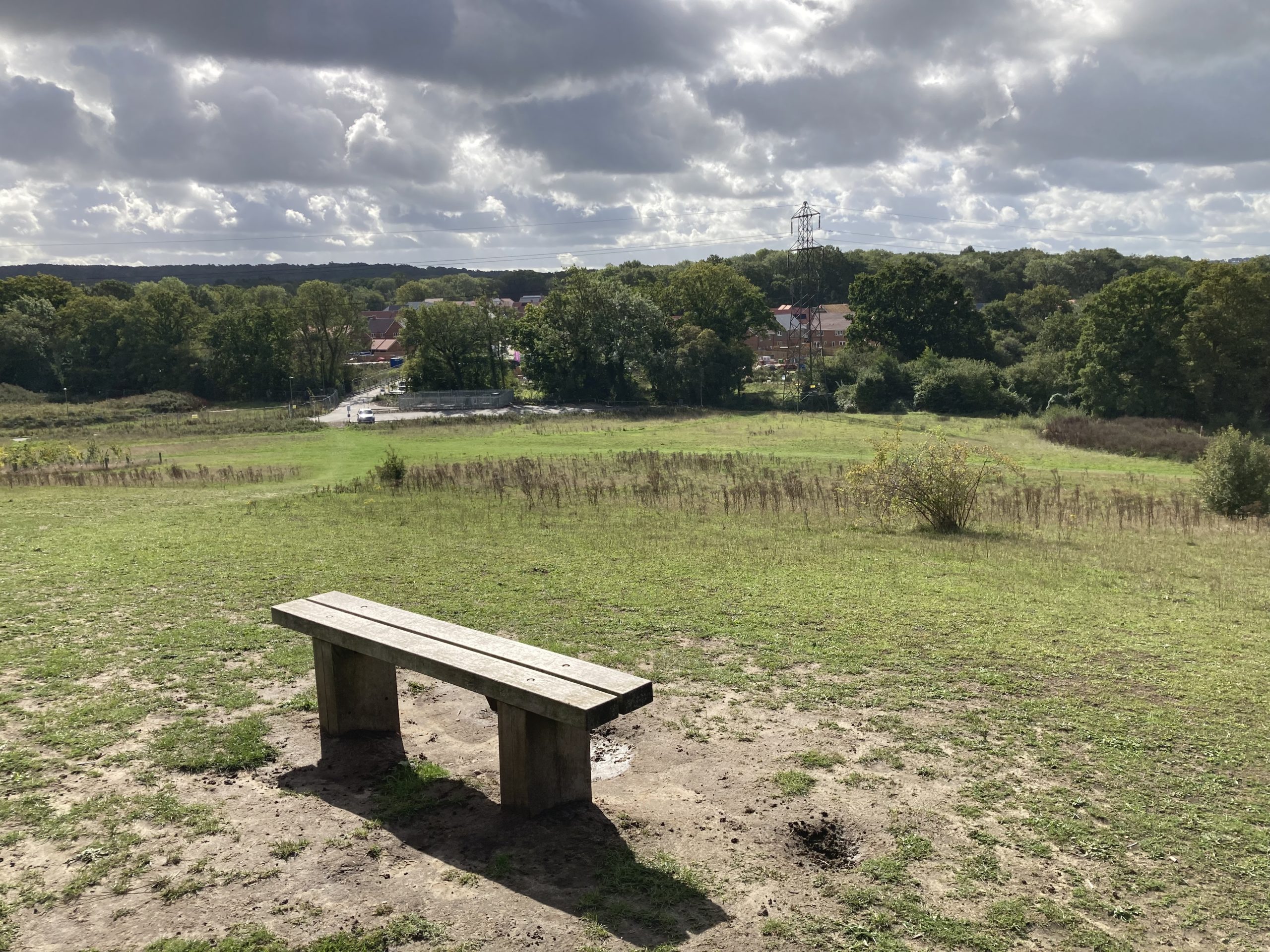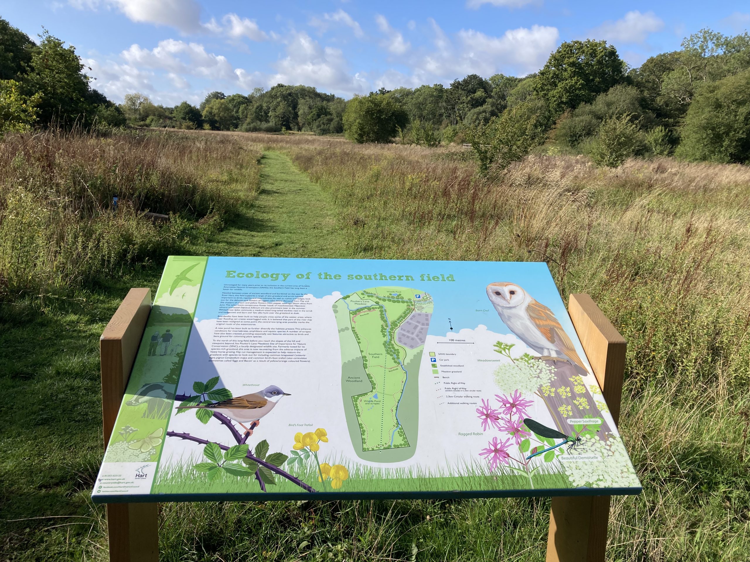A housing development is being built, but Poulters Meadows still makes a peaceful and very attractive walk. There’s a large expanse of water meadow to explore, with streams and extensive boardwalks. As you arrive, you look up to a small knoll and a detour to the top is rewarded by a bench and a view, and in early summer, a sea of buttercups and daisies. Named Albany Farm on current Ordnance Survey maps, the name of the farm that used to be here, the hill is known locally as Hillyburrow, named after the local rabbits.